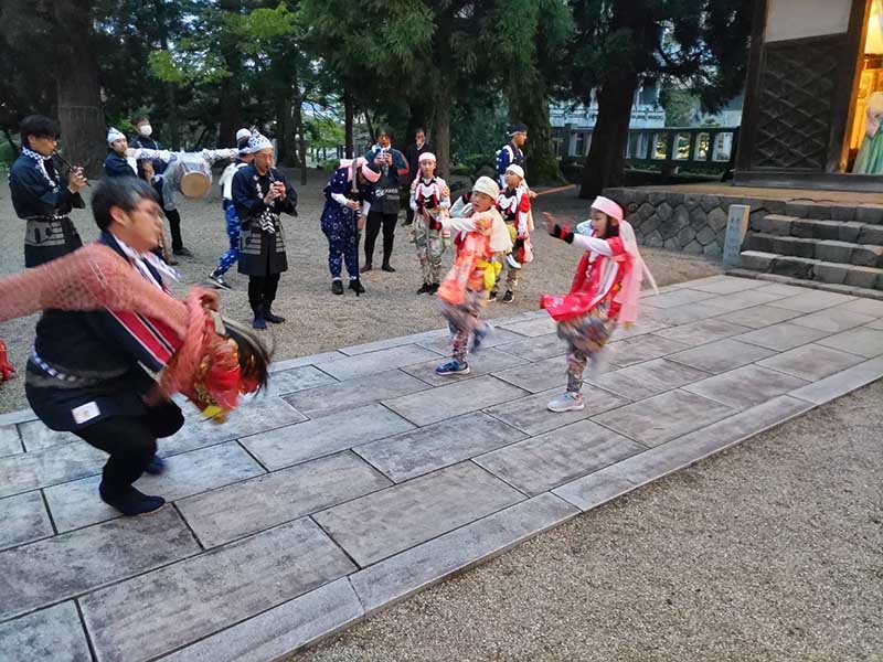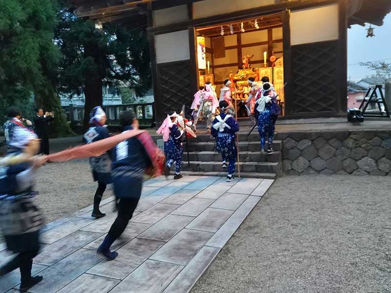 お神輿巡行に併せて、小学生から中学生までの子どもたちと青年団が、町内の各家々を訪問し、獅子舞を披露して回るところが見どころです。