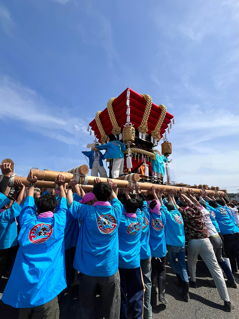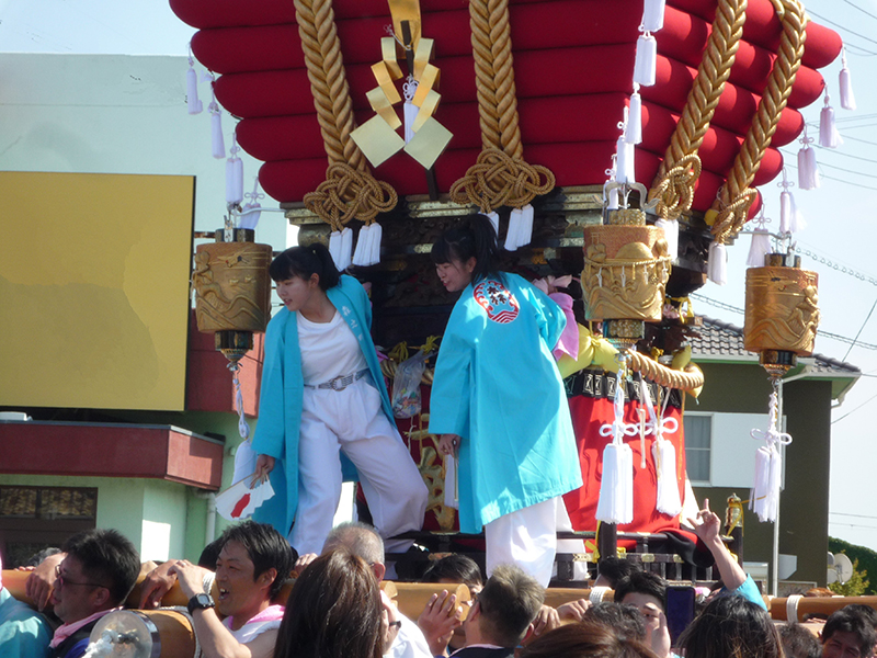 引野町内会の檀尻や中北町内会、森町内会の布団檀尻の3台が練り込み、五穀豊穣、豊漁、子供の成長を祈る。地元中学生の ギャル御輿も好評です。