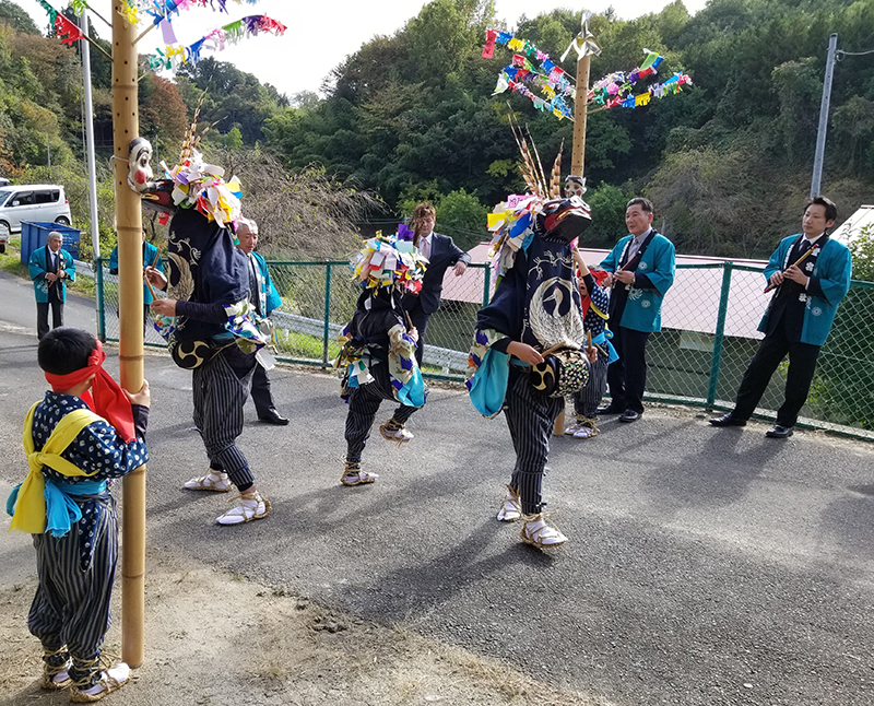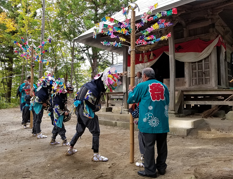 宿元から神社までの間は、「道引」という道中囃子を奏で、舞庭にはいると、2本のささら竹の間に3人の獅子が入って舞います。演目は、舞出し・神拝み・ぬかばがかり・みそぎ・三つ輪・歌切り・雌獅子追い・頭揃い・そぞろき・波返し・トートメロ・もどり太鼓の12種目を伝えており、囃子は笛、太鼓によります。