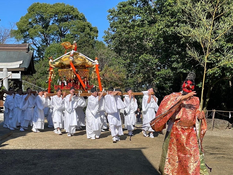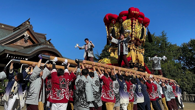 太鼓台は土曜日(宵祭り)、太鼓橋での御祓いから始まり、各地区を運行し、地域を練り歩きます。日曜日(本祭り)は、正午に神社へのお上り、14時から神幸祭での本殿回り、神事場へのお下り、15時から御旅所祭での御回りが行われ、例大祭は終わりとなります。