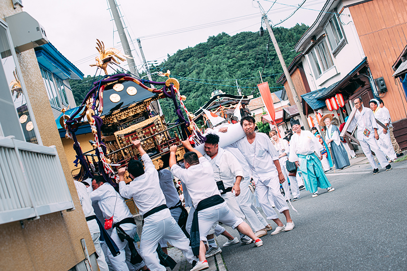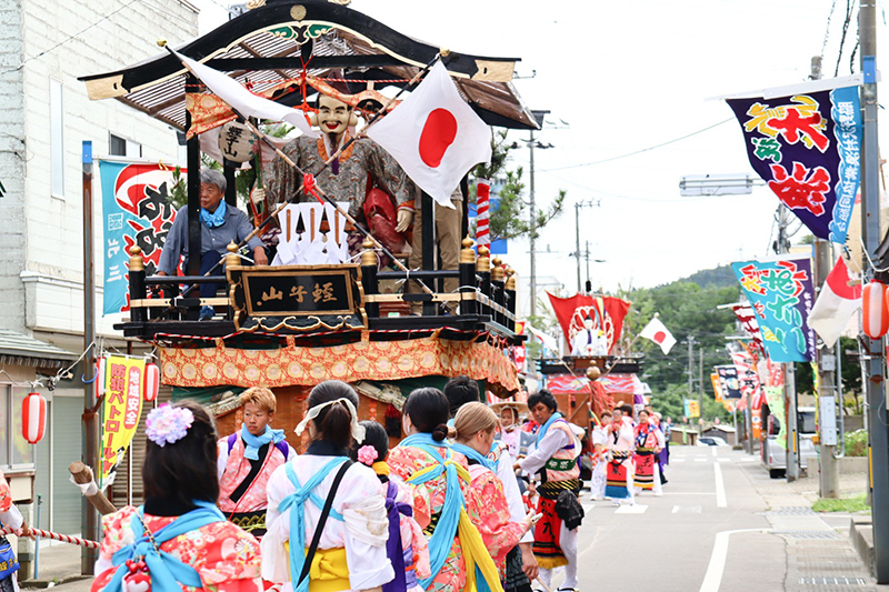 勇壮かつ煌びやかな神輿、豪華絢爛な2台の山車、さらに県内では珍しい京都風の道中神楽を有するお祭りであり、さらにこの3日間は町のメインストリートに大漁旗や提灯が掲げられ、にぎやかな雰囲気で盛り上がります。