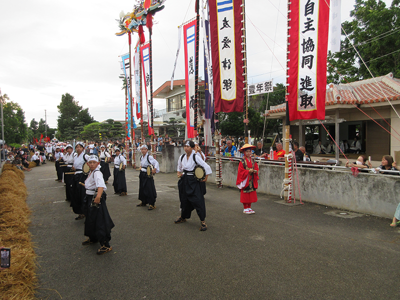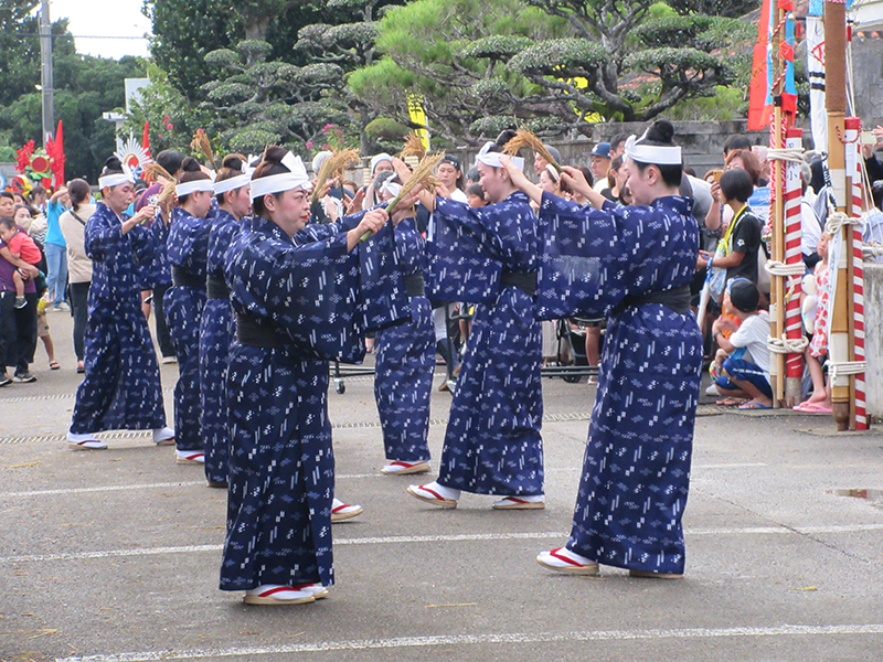 青年たちによる旗頭奉納、神司・長老らによるユークイ(世乞い)、中学生によるイリク太鼓、女性たちによる舞踊「平得世果報節」、東西の武将による演舞「ツナヌミン」、大綱引き。