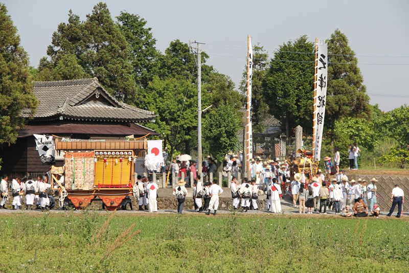 その角田八幡神社で行われる春の神幸祭は、豊前楽(隔年奉納)の他、神輿、傘鉾、山車(祇園車)が、角田地区の各町内を巡行して2日間にわたり盛大に執り行われる祭りです。