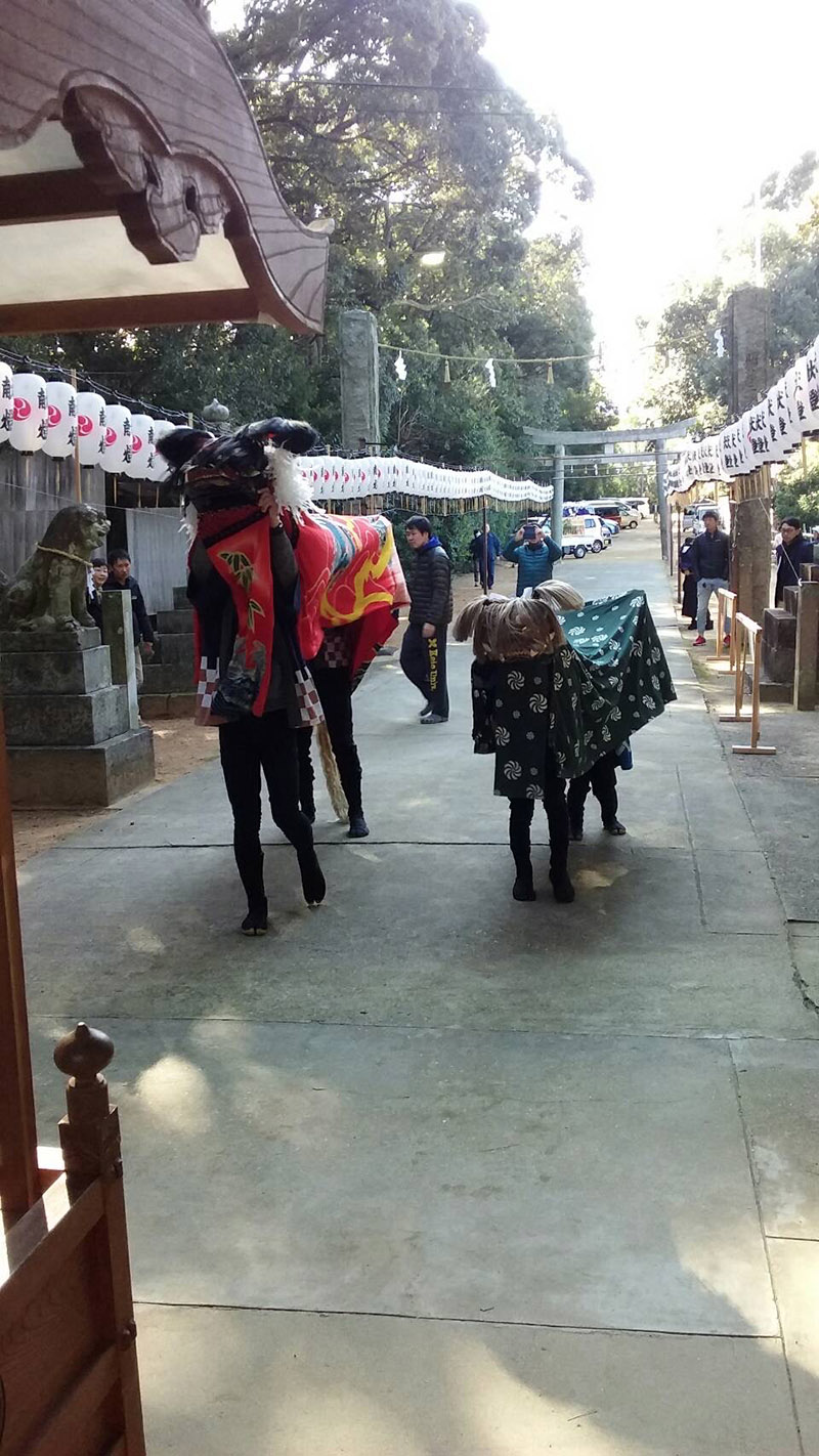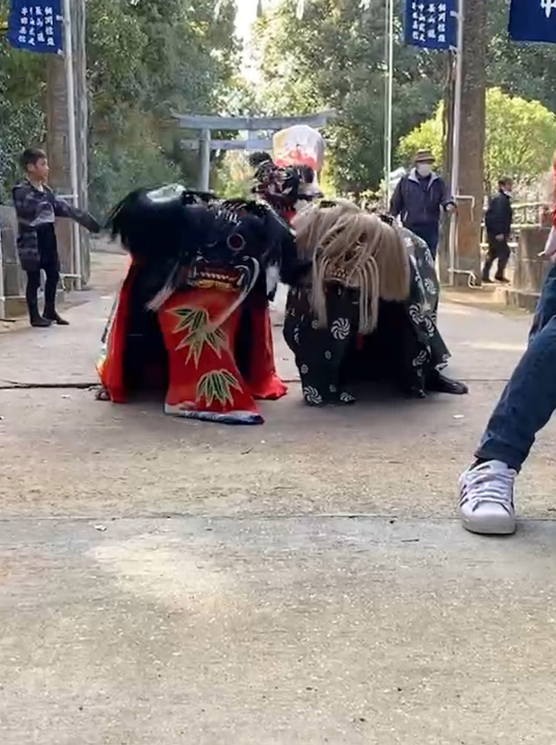 まず本殿前にて、西連・東連の2組による獅子舞が同時に奉納され、祭りの幕が開きます。