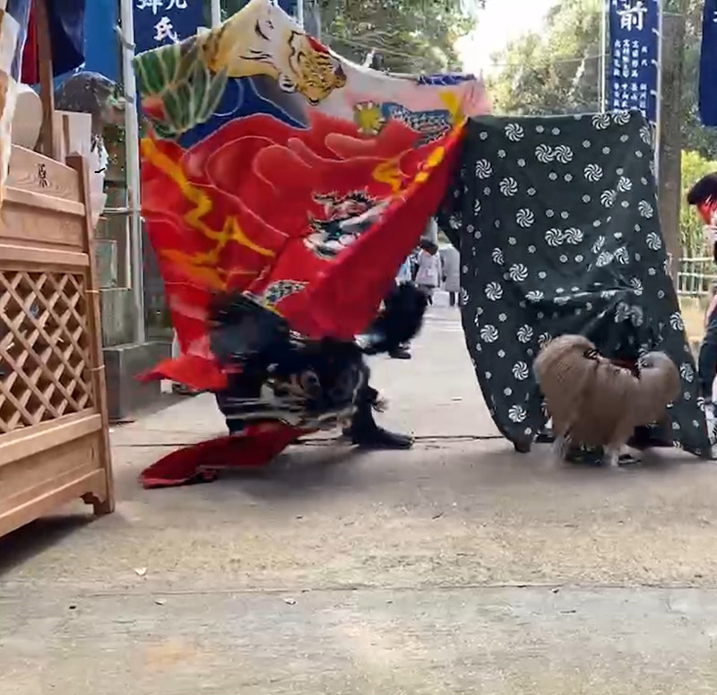 現在、8つの地区の獅子連が奉納を行っており、平獅子3連と牡丹くずし5連が、それぞれ個性ある舞を披露します。なかでも見どころは、祭りの締めくくりとして奉納される大獅子の舞。各獅子連の担い手たちが力を合わせ、随身門から本殿へと大獅子を舞わせる姿には、神社全体の一体感と熱気があふれます。