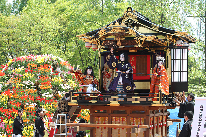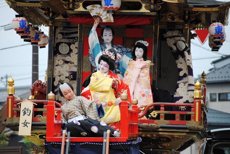 曳山は、西町、中町、東の3基あり、当番町制で歌舞伎が奉納される。子供役者は当番町在住の子どもたちが務める。歌舞伎芝居の稽古は約3か月続けられ、祭り当日に披露される。